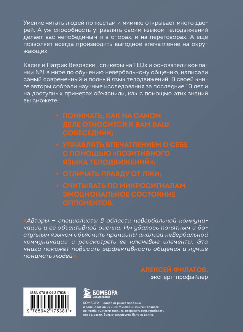 «Авторы — специалисты в области невербальной коммуникации и ее объективной оценки. Им удалось понятным и доступным языком объяснить принципы анализа невербальной коммуникации и рассмотреть ее ключевые элементы. Эта книга поможет повысить эффективность общения и лучше понимать людей». — АЛЕКСЕЙ ФИЛАТОВ, эксперт-профайлер
