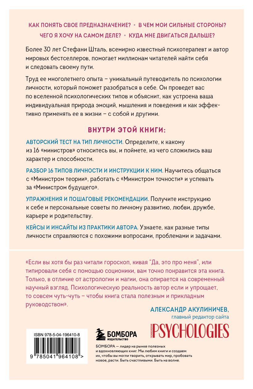 Внутри этой книги: - Авторский тест на тип личности. Определите, к какому «министру» из 16 типов личности относитесь вы, и поймете, из чего сложились ваш характер и способности. - Разбор 16 типов личности и инструкции к ним. Научитесь общаться с «Министром теории», работать с «Министром точности» и успевать за «Министром будущего».