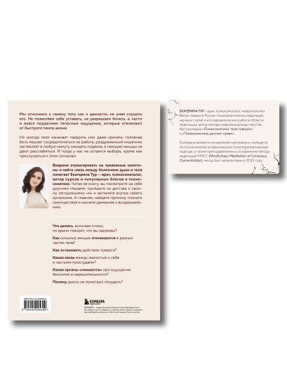 Тело никогда не лжет — оно кричит там, где молчит душа. Екатерина Тур — врач, психосоматолог. Основатель крупнейших сообществ по психосоматике в России, специалист научного направления психосоматики в практическом психотерапевтическом подходе. Основатель образовательной системы по управлению эмоциональным интеллектом для детей и взрослых. Автор научных статей и исследовательских работ в области нейромедитаций и психосоматотерапии.