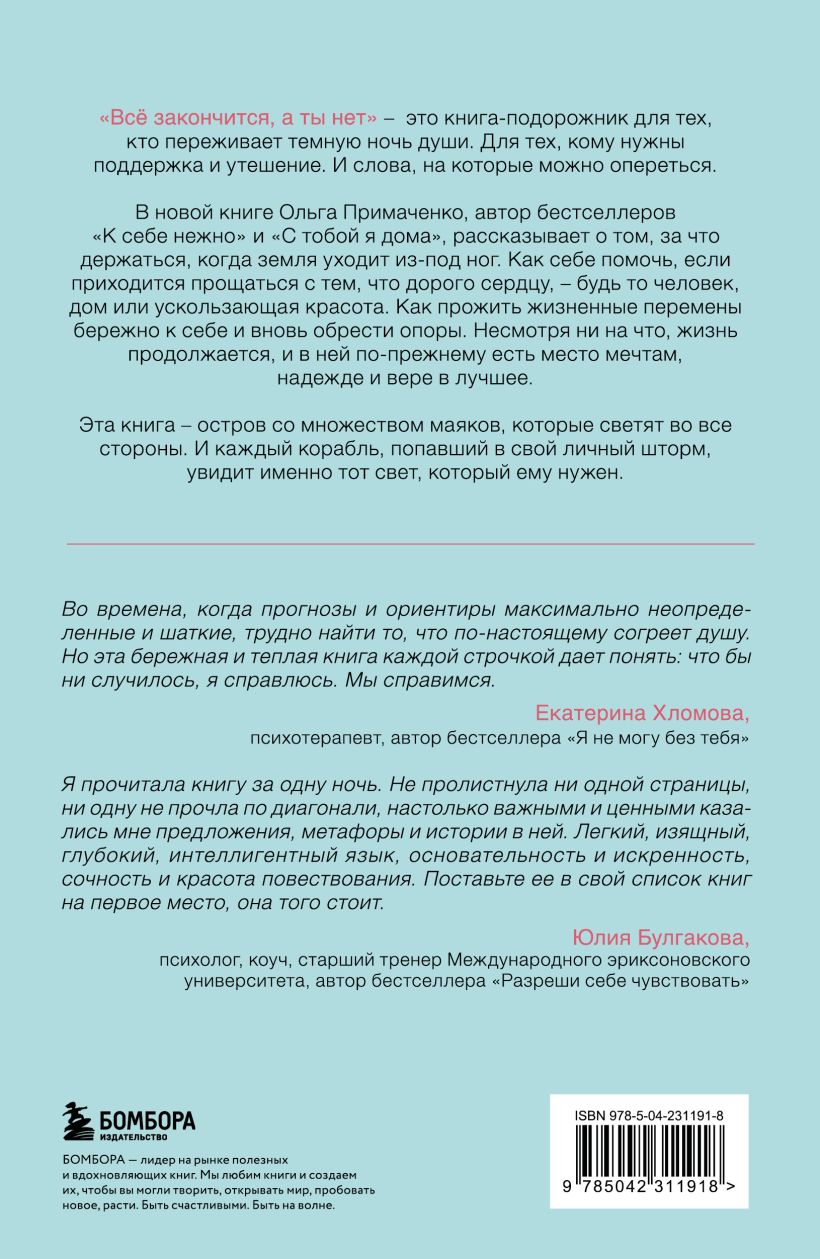«Всё закончится, а ты нет» ─ это книга-подорожник для тех, кто переживает темную ночь души. Для тех, кому нужна поддержка и утешение. И слова, на которые можно опереться.