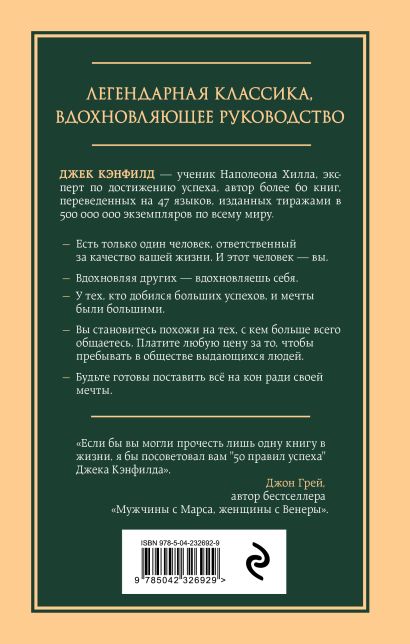 Книга написана тремя авторами. Самый известный из них, Джек Кэнфилд — эксперт по достижению успеха, ученик легендарного Наполеона Хилла, автор более 60 книг, переведенных на 39 языков. В том числе знаменитого «Куриного бульона для души», чей тираж в мире уже перевалил за 500 000 000 экземпляров. Ежегодный доход Кэнфилда превышает несколько миллионов долларов. Его имя занесено в Книгу рекордов Гиннесса.